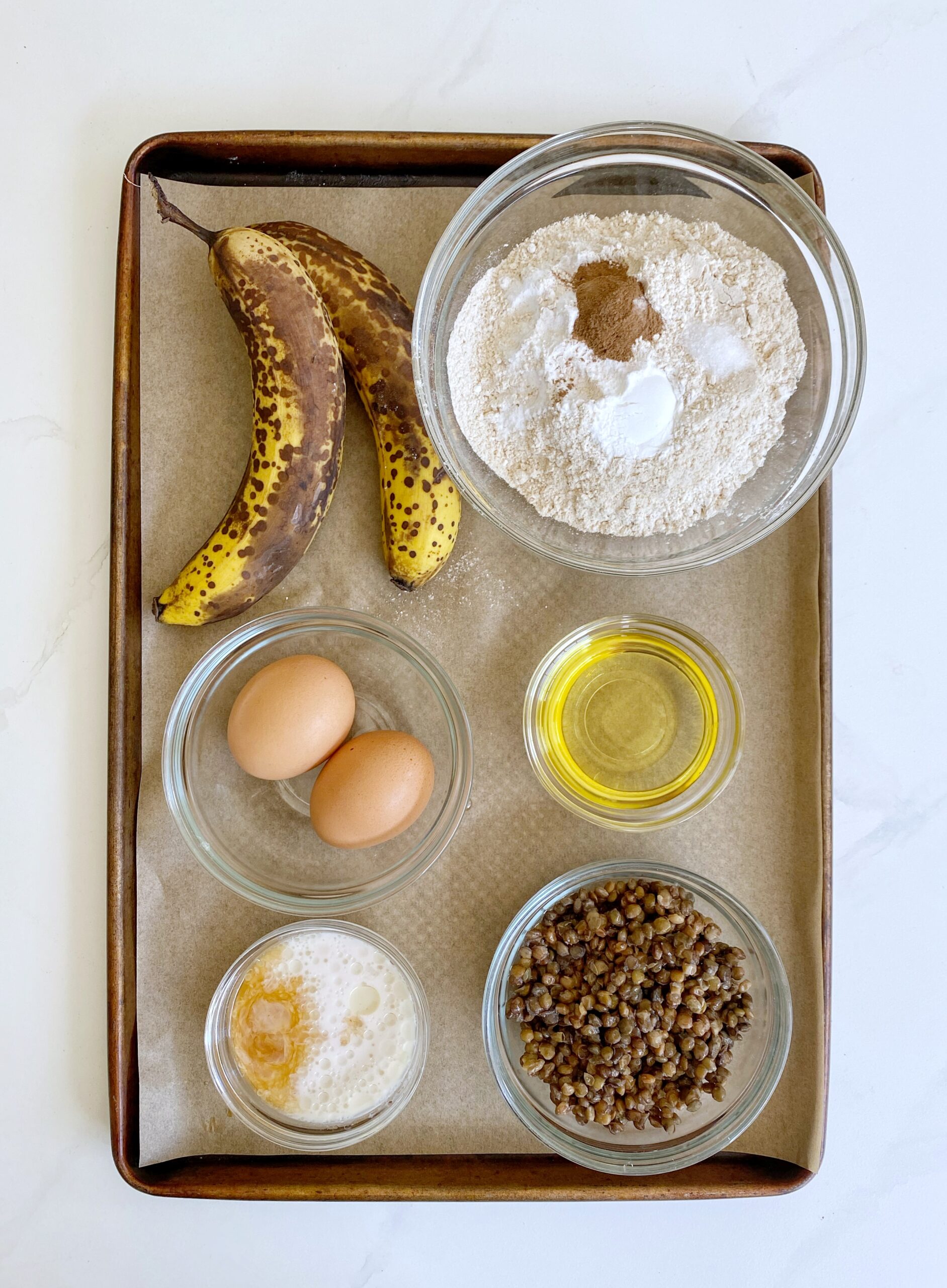 - Ingredients: Bananas, eggs, avocado or vegetable oil, brown or green lentils, maple syrup or honey, milk, vanilla extract, white wine vinegar or apple cider vinegar, vanilla extract, whole wheat or all-purpose, or gluten-free flour, cinnamon, baking powder, fine salt