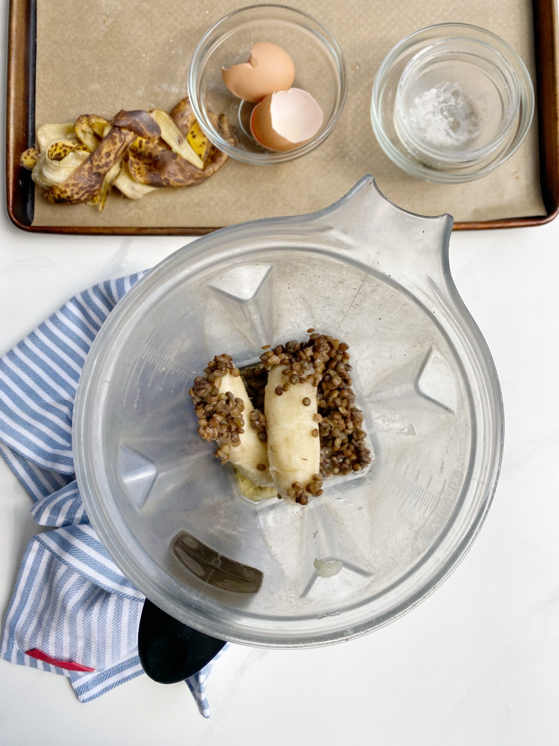 - Add bananas, eggs, lentils, oil, maple syrup, milk, vanilla, and vinegar to a blender. Blend until smooth.